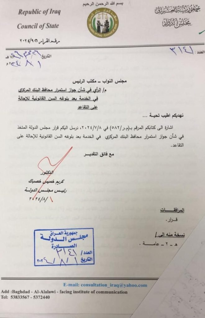(وثائق) .. هكذا رد مجلس الدولة حول قانونية منصب محافظ البنك المركزي العراقي علي العلاق